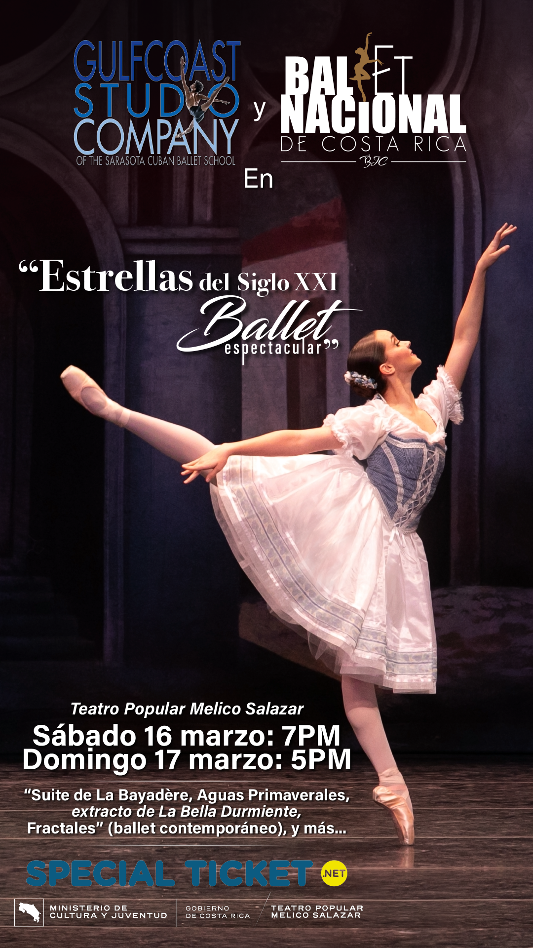 Por primera vez en Costa Rica, Ballet Nacional de Costa Rica se une a una de las prestigiosas compañías de Ballet Cubano, Gulfcoast Studio Company. Juntas con sus destacados bailarines darán vida al espectáculo llamado “Estrellas del Siglo XXI: Ballet Espectacular”, que se presentará en el Teatro Mélico Salazar los días 16 y 17 de marzo de este año.