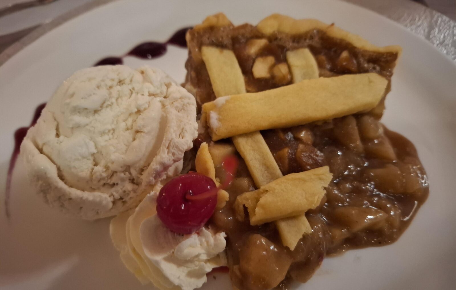 El menú incluye además pechuga de pavo en salsa de mora y lomo de cerdo en salsa hawaiana, para cerrar con un exquisito pie de manzana. Se puede elegir entre copa de vino o jugo natural.