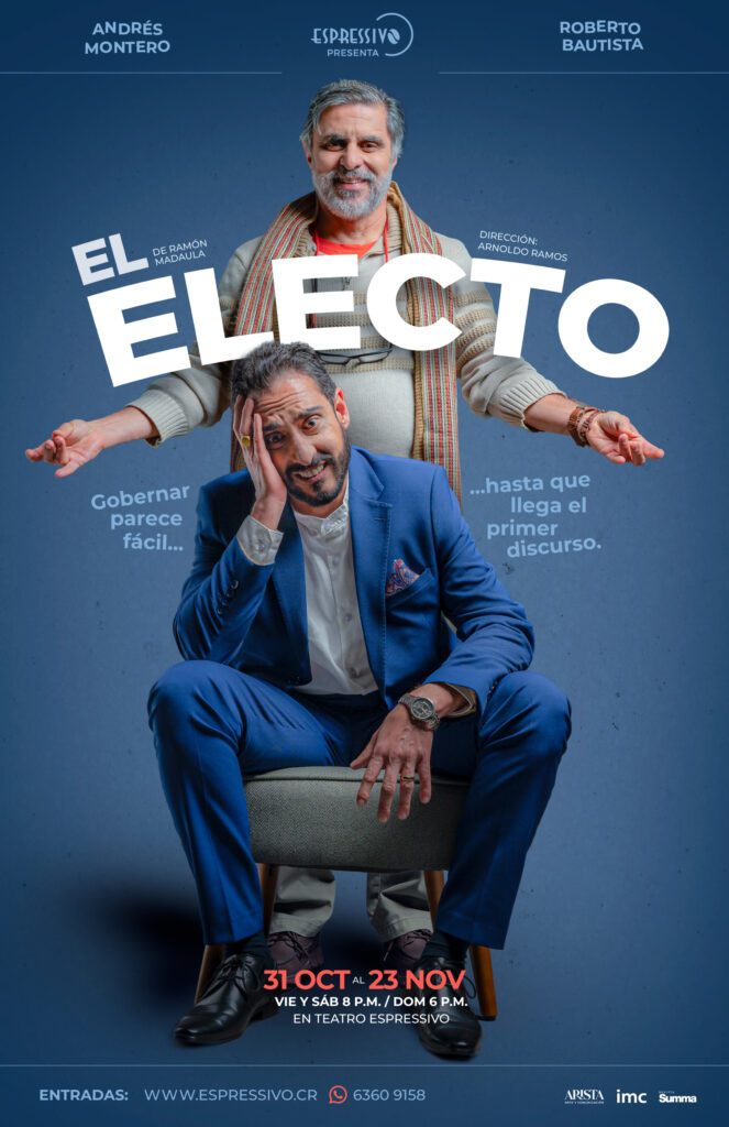 Escrita por el dramaturgo español Ramón Madaula, El Electo transcurre en el despacho del presidente electo, interpretado por Roberto Bautista, cuyo equipo llama de emergencia a un psiquiatra, encarnado por Andrés Montero. Lo que sigue es una conversación tan íntima como reveladora, que expone las inseguridades y contradicciones de quienes buscan dirigir a otros. “Hace unos días comenzó la campaña electoral en Costa Rica, y ya vemos —otra vez— esas máscaras que candidatos y candidatas se colocan. Justamente de eso trata El Electo: de lo que se esconde detrás del poder”, señaló Natalia Rodríguez Mata, gerente general de Grupo Espressivo.