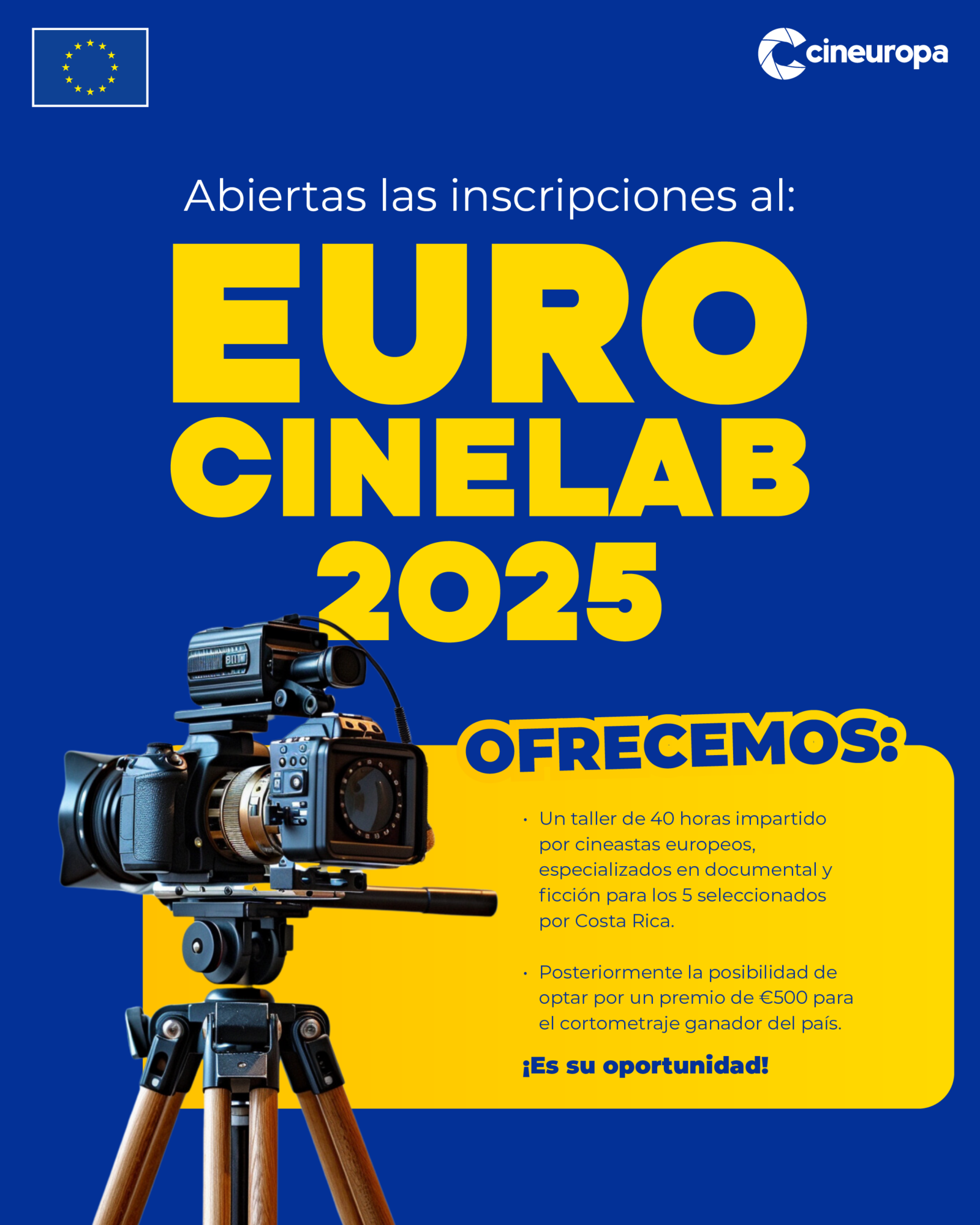 Cine Europa lanza una nueva edición de Euro CineLab, un curso dirigido a profesionales del cine y personas autodidactas que desean iniciarse en la producción cinematográfica. Esta iniciativa, respaldada por las Delegaciones de la Unión Europea en varios países de Centroamérica, busca fomentar la producción de cortometrajes y fortalecer la industria audiovisual en la región. El curso se enfocará en cine documental y se desarrollará dentro de los festivales de cine europeo que se celebrarán entre mayo y julio de 2025.