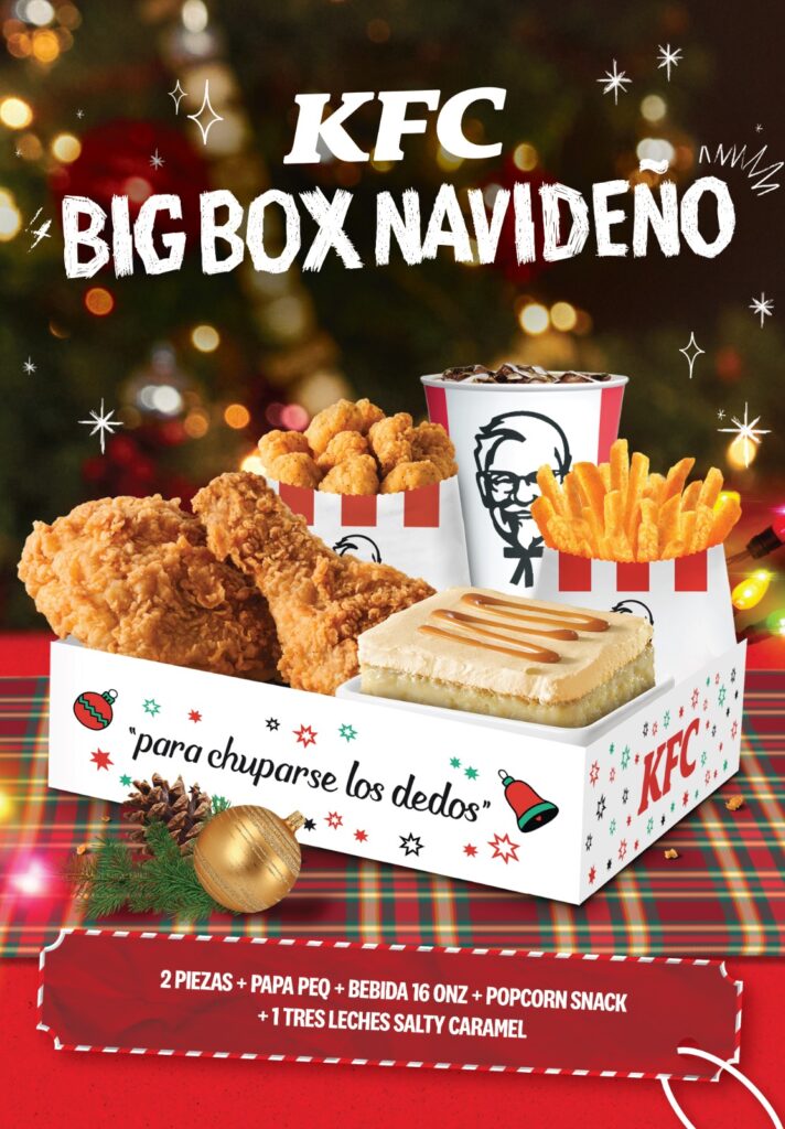 El Mega Navidad incluye 10 piezas de pollo, 2 ensaladas individuales, 2 papas combo, 2 purés individuales y 2 postres Salty Caramel, a un precio de ¢16.990. Mientras que el Big Box Navideño ofrece 2 piezas de pollo, 1 papa pequeña, 1 bebida de 16 oz, 1 popcorn snack y 1 postre Salty Caramel por ¢6.000. Ambas promociones estarán disponibles por tiempo limitado en los 66 restaurantes de KFC a nivel nacional, incluyendo autoservicio, la aplicación móvil, el sitio web oficial y las principales plataformas de delivery.