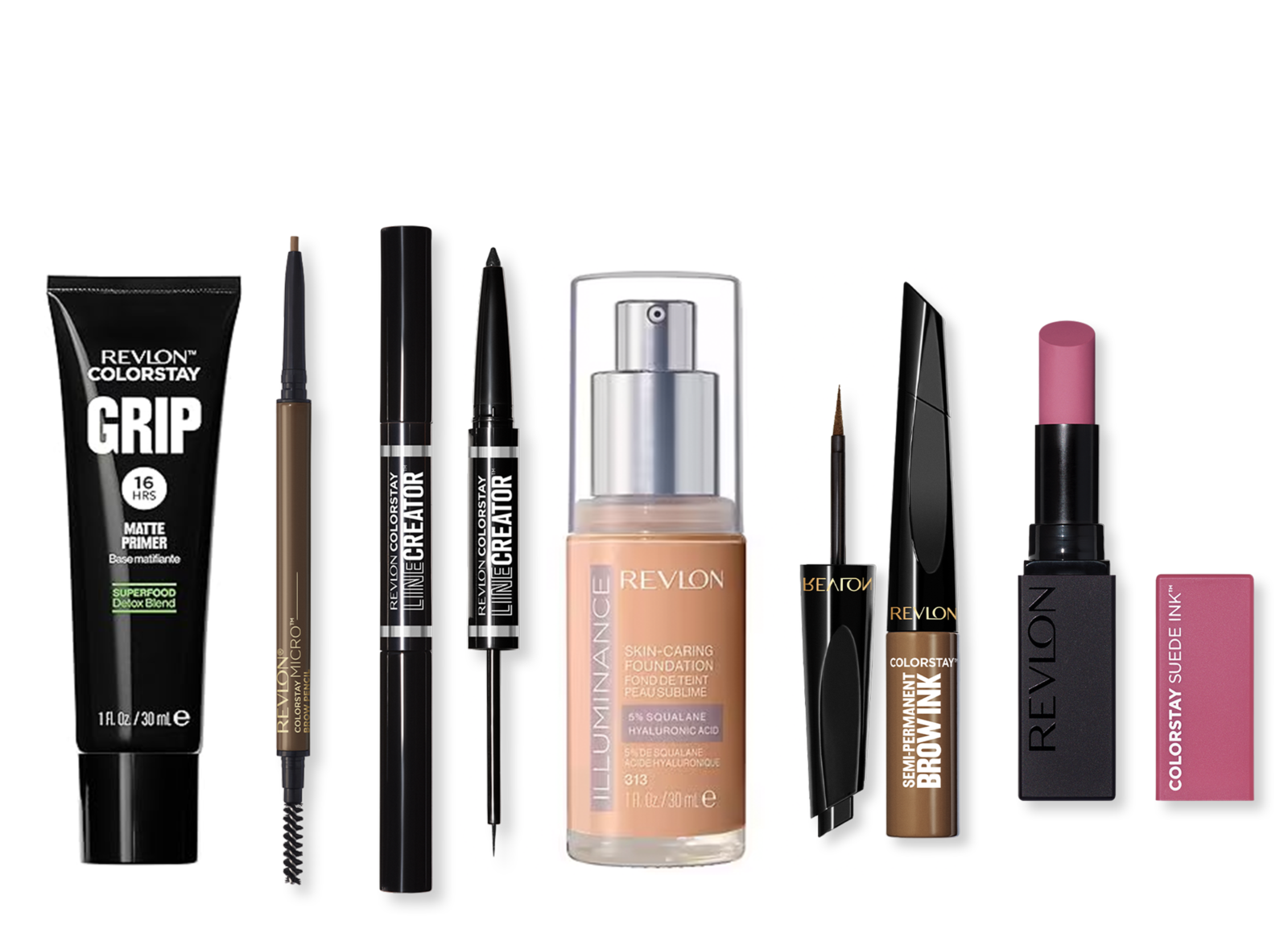 El lápiz para cejas Revlon Colorstay™ Micro brow pencil, la tinta para cejas Revlon Colorstay™ semi-permanent brow ink, el delineador líquido Revlon Colorstay™ Micro easy precisión liquid, el labial Revlon Colorstay Suede Ink™ Lipstick, la pre base o primer Revlon Colostay Grip Matte Primer y sin duda, la reina de la temporada, la base Revlon Illuminance skin-caring Foundation.