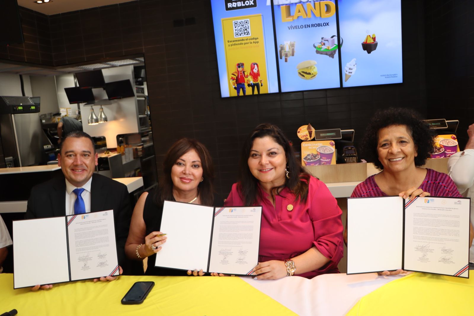 Esta mañana, en el restaurante McDonald’s ubicado en Nicoya, la Ministra de la Condición de la Mujer, Cindy Quesada Hernández; la Presidenta Ejecutiva del INAMU, Adilia Caravaca Zúñiga; la embajadora Marlene Fernández del Granado, vicepresidenta para América Latina y el Caribe y líder del Comité de Diversidad e Inclusión de la empresa Arcos Dorados, y Esteban Sequeira, Director General de Arcos Dorados Costa Rica, firmaron el acta de compromisos de parte de Arcos Dorados para iniciar el proceso de certificación de la norma nacional INTE G38-3:2021