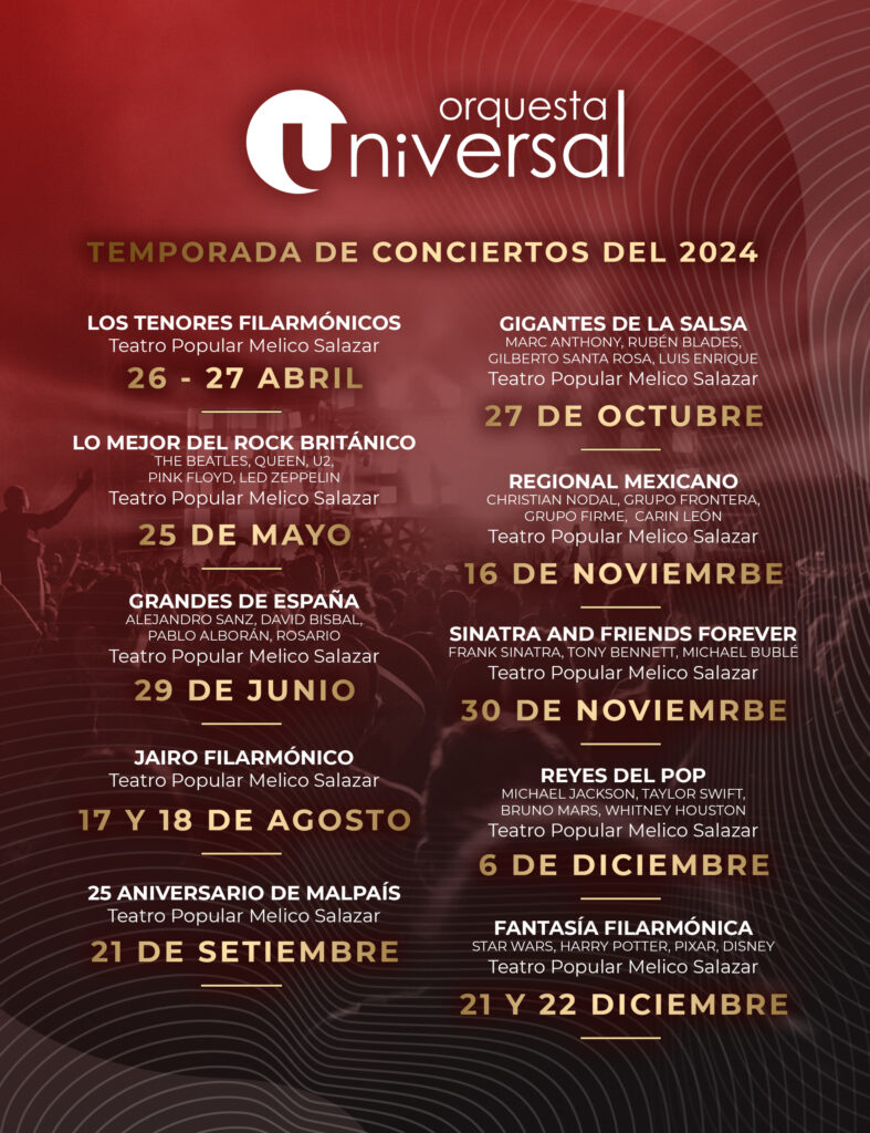 Otros de los conciertos que ofrecerá la orquesta a lo largo del año son “Lo Mejor del Rock Británico”, “Gigantes de la Salsa”, “Grandes de España”, “Reyes del Pop”, “Jairo Filarmónico”, “Malpaís 25 Aniversario”, “Fantasía Filarmónica” y “Sinatra and Friends Forever”, entre otros.