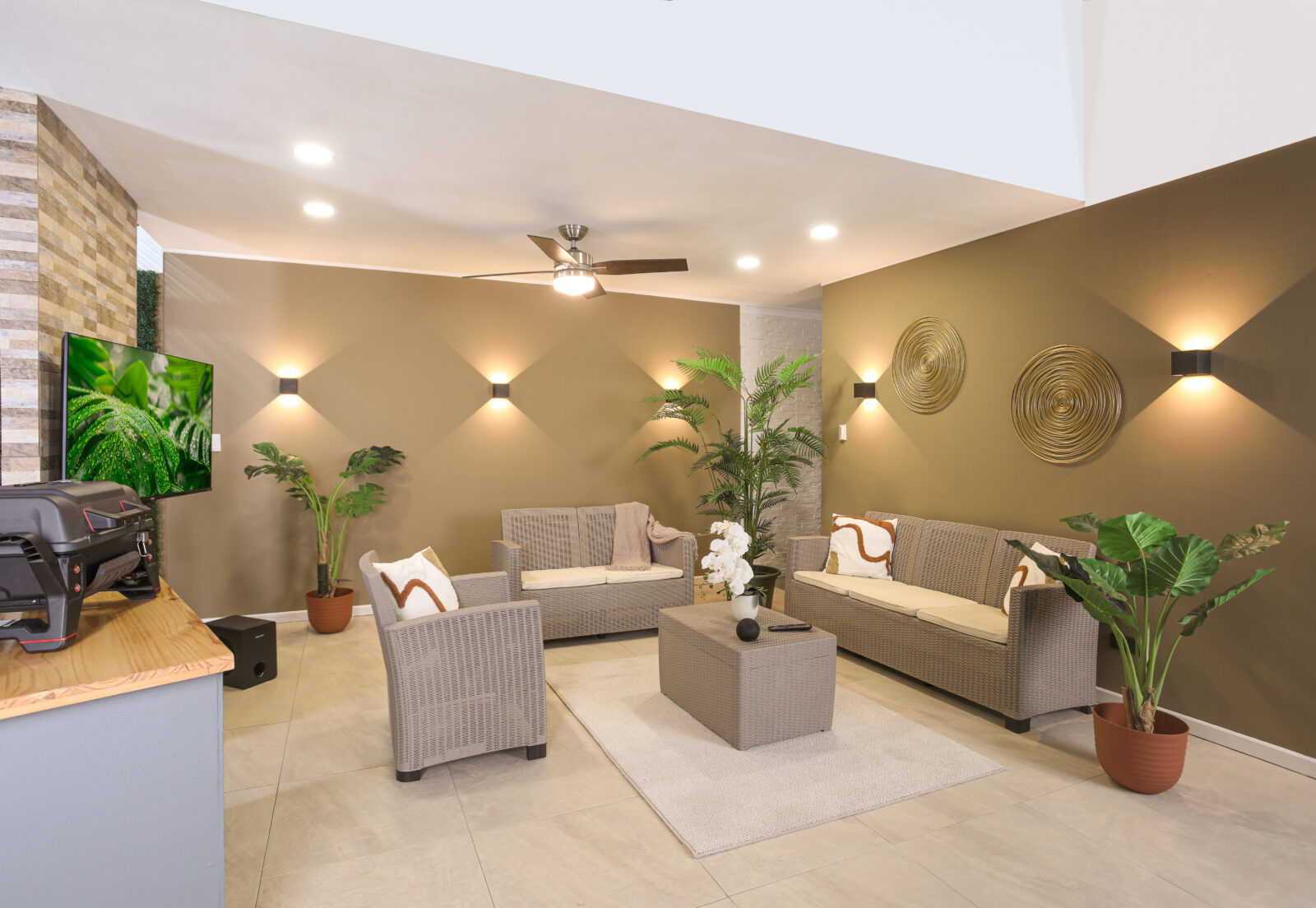 Muebles de exterior: Un área cómoda para interactuar es imprescindible. Incorpore mesas, sofás y sillas ideales para espacios abiertos, creando áreas cómodas que permitan organizar reuniones al aire libre en un entorno relajado y estilizado. Recuerde considerar el clima del lugar para seleccionar un material que resista las inclemencias del tiempo.