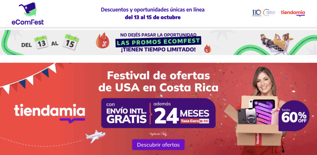 Con la misión de consolidar un ecosistema de compras en línea seguro y confiable, Tiendamia será una de las marcas protagonistas de la primera edición del EcomFest 2025, evento organizado por la Cámara de Comercio de Costa Rica, que se celebrará del 13 al 15 de octubre a través de la plataforma www.ecomfestcr.com. Durante tres días, los consumidores podrán disfrutar de descuentos de entre 15% y 50% en productos de marcas como Walmart, Grupo Monge, Gollo, Universal y Repuestos La Guacamaya, en un entorno digital avalado por la Cámara.
